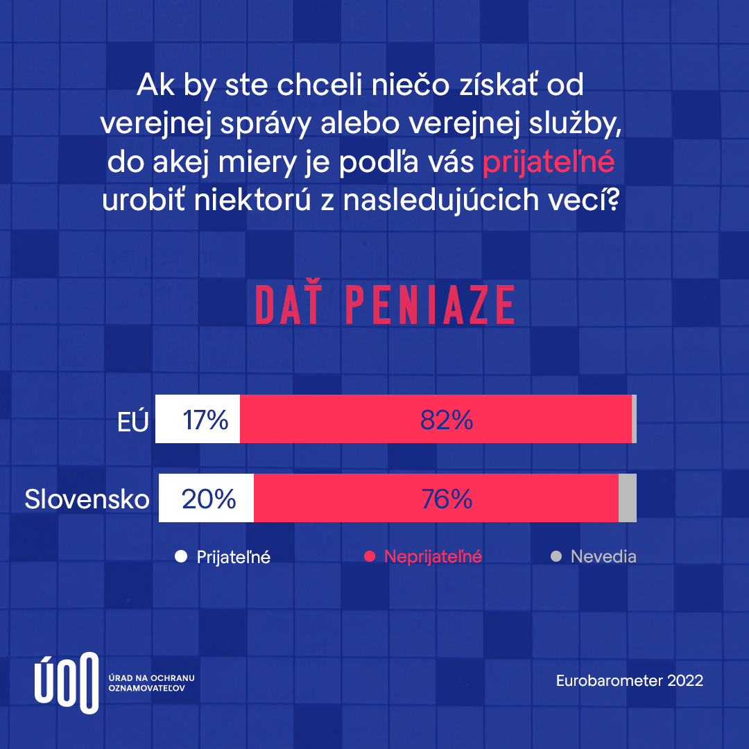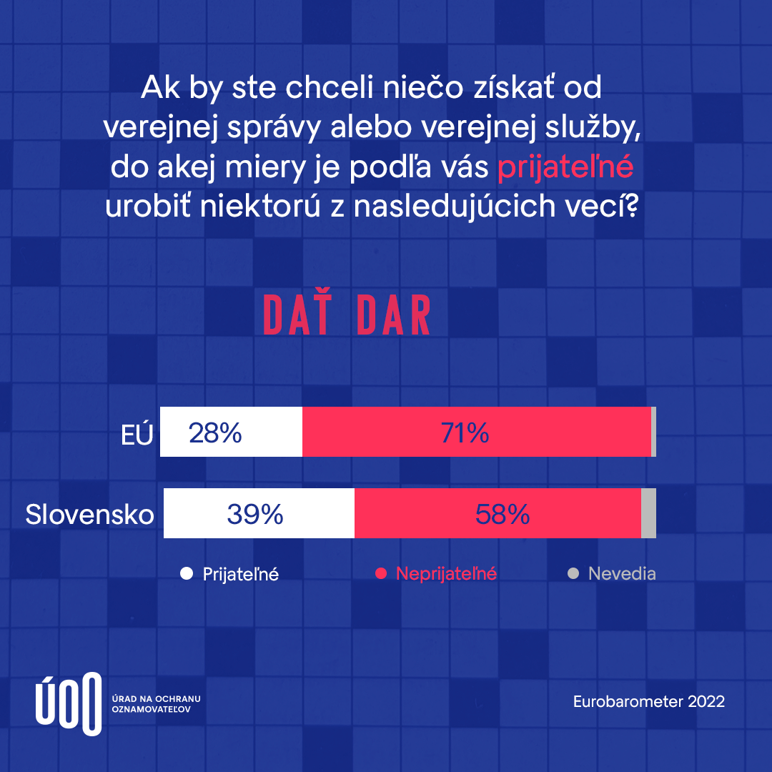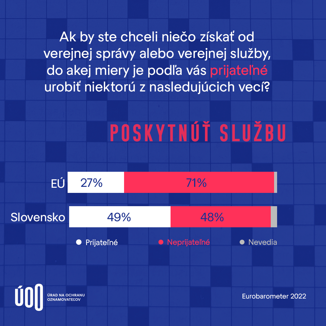 Až 49 percent opýtaných Slovákov považuje za prijateľné poskytnúť službu, ak by chceli niečo získať od verejnej správy. Priemer EÚ je pritom 27 percent. Aj v prípade darov sme nad priemerom Únie. Ochotných ho dať by bolo 39 percent opýtaných Slovákov, priemer EÚ je 28 percent.